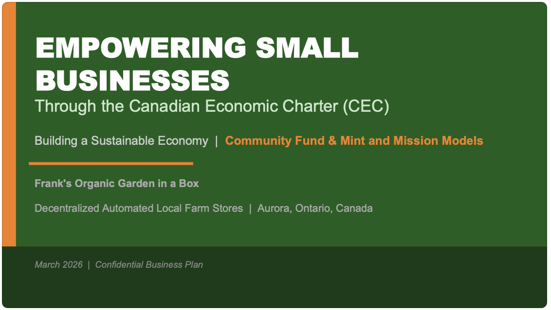 Pitch deck for the Garden in a Box Business Plan. Building a Sustainable Economy through Empowering Small Businesses with Decentralized Automated Local Farm Stores.